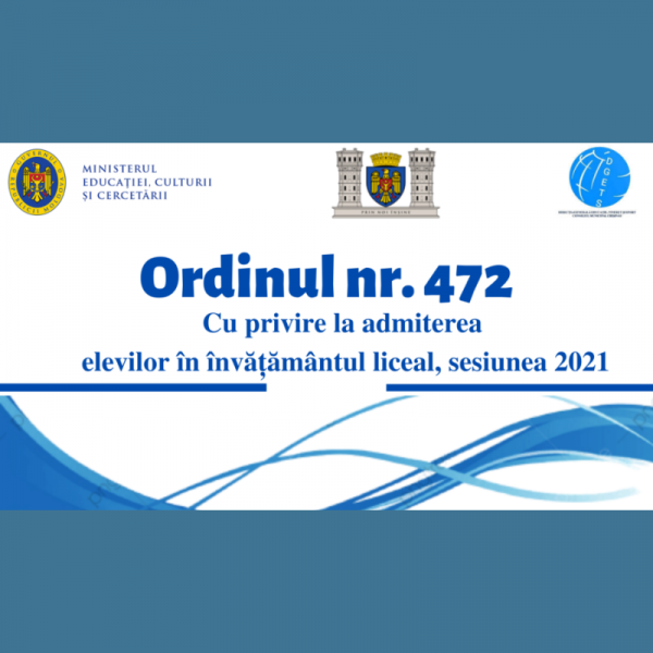 Totodată, admiterea în învățământul liceal în anul de studii 2021-2022 este organizată conform prevederilor ordinului MECC nr. 700 din 07.06.2021 „Cu privire la admiterea elevilor în învățământul liceal, sesiunea 2021”, ordinului DGETS nr. 472 din 23.06.2021 „Cu privire la admiterea elevilor în învățământul liceal, sesiunea 2021”. Directorii instituțiilor de învățământ liceal care organizează probe suplimentare în cadrul admiterii sunt responsabili de elaborarea și aplicarea corectă a instrumentelor de evaluare ce fac parte din Portofoliul probei de admitere.