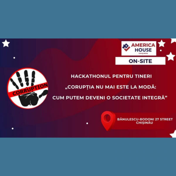 America House Chișinău invită tinerii 16-21 ani la Hackathon-ul „Corupția nu mai este la modă – cum putem deveni o societate integră”, program concurs în echipe, 5 zile de instruire, 17-21 august, 17:30-19:30, cu prezență fizică, str Bănulescu Bodoni 27. Înregistrare: